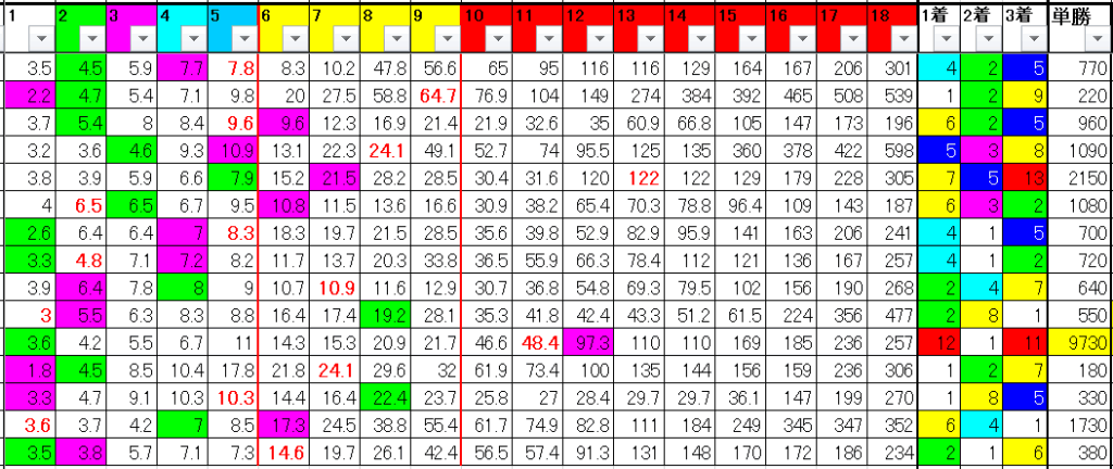 直近15レースの結果表は以下のとおりだ。先ほどの単勝人気別出現率表からは読み取れない情報を得ることが出来る。