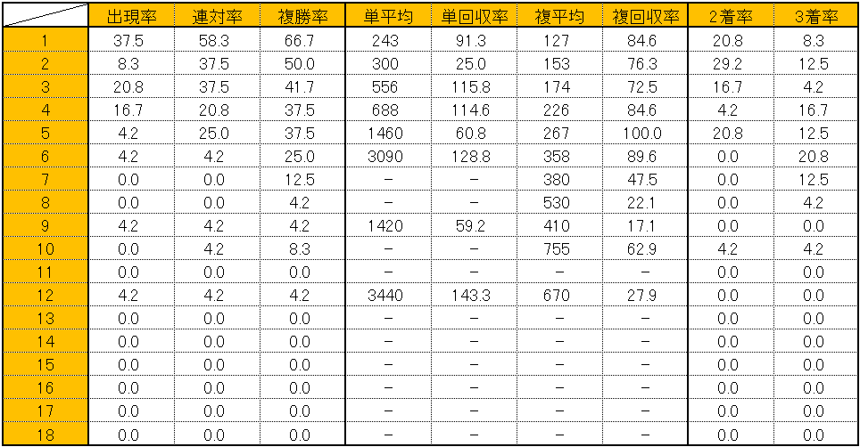 単勝1番人気の信頼度は平均よりやや高く、出現率は37.5%、単勝回収率は91.3%を示している。一方で単勝2番人気は出現率が8.3%しかなく、アタマから狙うのは禁物だ。単勝3・4番人気は出現率が高く、単勝回収率も100%を超えており、投資効率的に狙い目だ。