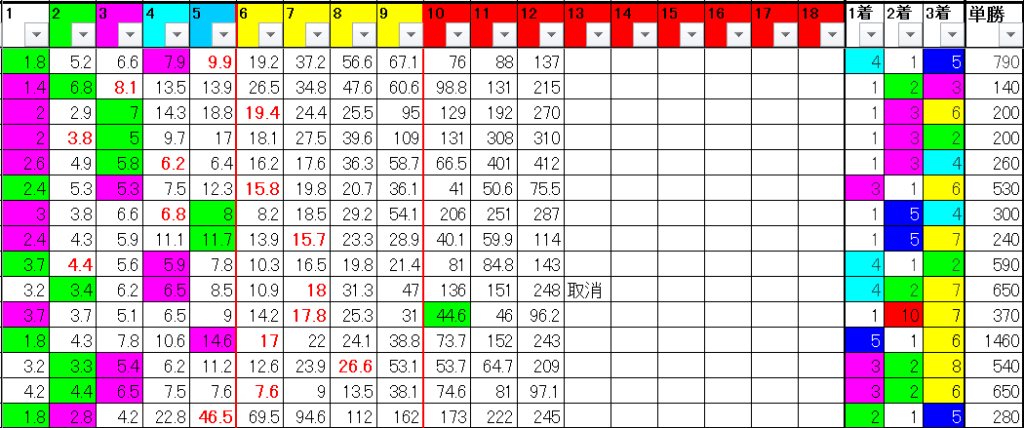 直近15レースの結果表は以下のとおりだ。先ほどの単勝人気別出現率表からは読み取れない情報を得ることが出来る。