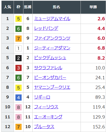 単勝6番人気が10.0倍で、先ほどのパターンに合致。狙いたいのは単勝2番人気を軸にした馬連。8番のレッドバンデが該当するが、結果はどうか。