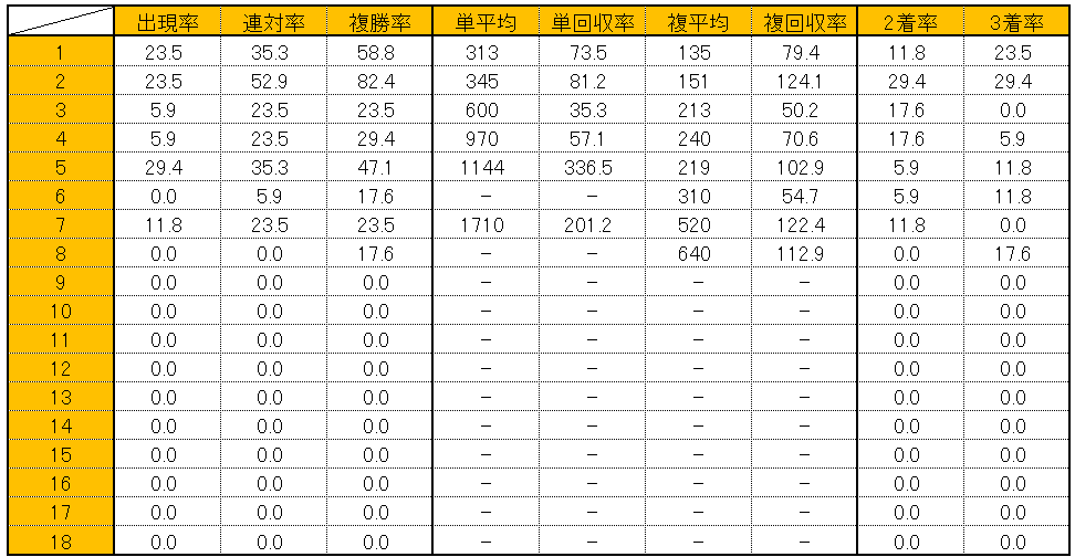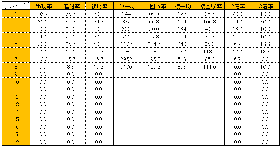 単勝1番人気の信頼度は平均並み。可もなく不可もなくといったところ。複勝率が抜きんでているのが単勝2番人気で、その確率は76.7%。単勝1番人気の数値をも上回っている。単勝回収率に注目すると、単勝5番人気が極めて高く、234.7%を示している。統計母数の問題もあるが、顕著な傾向として頭に入れておくべきだろう。