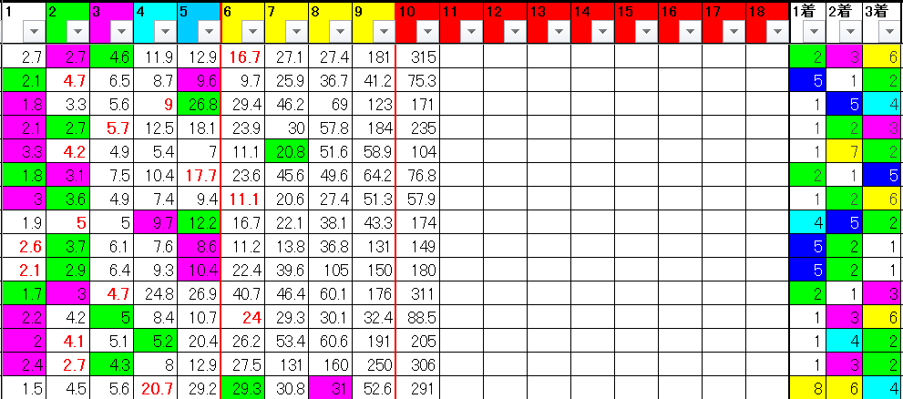 直近15レースの結果表は以下のとおりだ。先ほどの単勝人気別出現率表からは読み取れない情報を得ることが出来る。