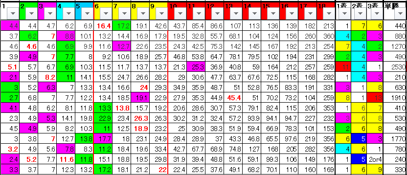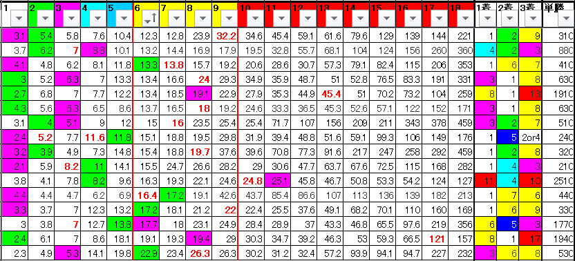 直近15レースの結果表は以下のとおりだ。先ほどの単勝人気別出現率表からは読み取れない情報を得ることが出来る。