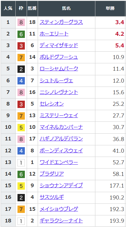 単勝1番人気のスティンガーグラスは、単勝オッズが3.4倍で本来なら狙うべき1番人気ではないが、今回は別。この馬を軸にして、単勝6~9番人気に流したワイドで的中率50%となるが、果たして結果は。