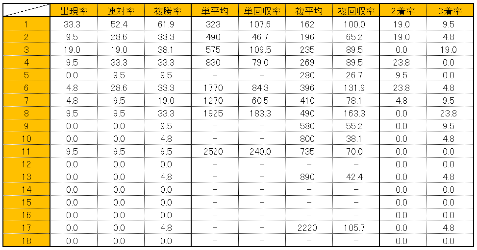単勝1番人気は15レース中5勝しかしていないが、勝った時のオッズが高いため投資効率は高くなっている。直近で勢いがあるのは単勝6番人気で、直近7レース中6レースで連対しており、確変状態だ。