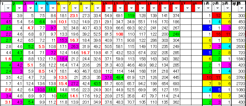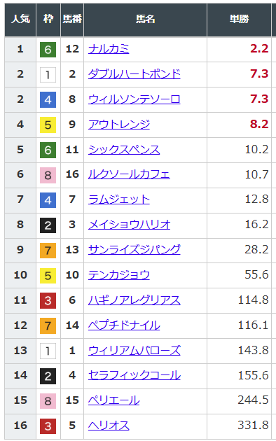 単勝8番人気が16.2倍で先ほどの条件に見事合致している。単勝1番人気のナルカミは、単勝2番人気とのオッズ差が開いており1強ムードとなっているが、過去のデータ的には勝つ確率は極めて低い。