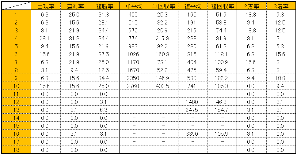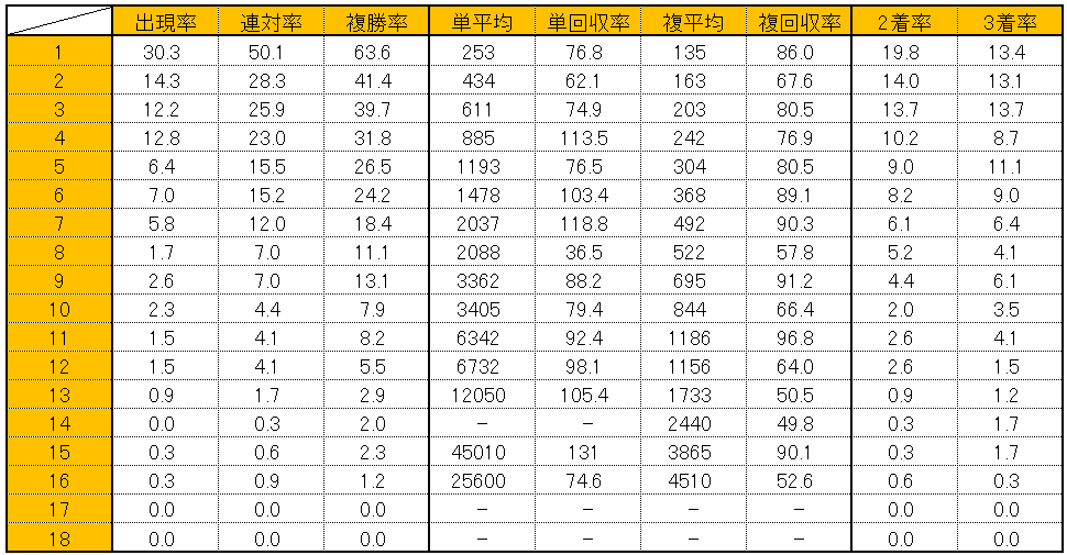 単勝1番人気の信頼度は平均または、それよりも若干高めとなっている。一方で単勝2番人気はやや不振で、その分単勝4番人気の出現率が高くなっている印象だ。なお単勝4番人気は単勝回収率が113.5%と投資効率は抜群で、長期的な視点では狙って損はない馬券だと言えよう。