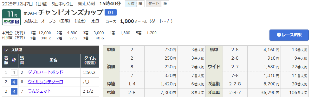 ナルカミは飛んだが、勝ったのは単勝3番人気のダブルハートボンド。残念ながら不的中だった。