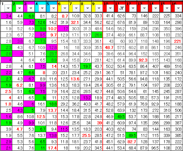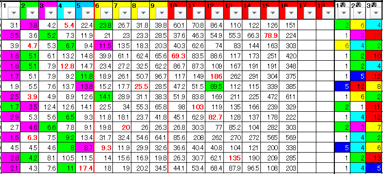 直近15レースの結果表は以下のとおりだ。先ほどの単勝人気別出現率表からは読み取れない情報を得ることが出来る。