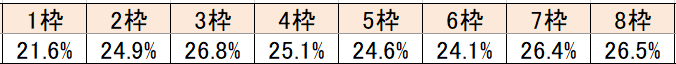 1枠の連対率は低かったが、5位には1-2の出目がランクインした。上位5点を買えば、的中率は21%となっており、こちらのデータも参考にされたい。