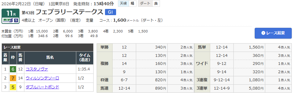 単勝2番人気のコスタノヴァが1着に。3着までは上位人気馬で決着したが、オッズも割れており、プラス収支で終えるのは至難なワザと言えそう。