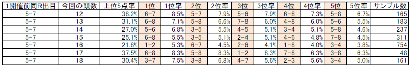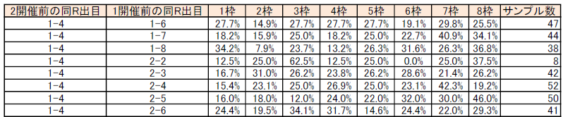 一番最初に掲載しているデータは、「前レースの出目」を元にして分析する方法だったが、今回はそれの「前日の出目バージョン」というわけだ。